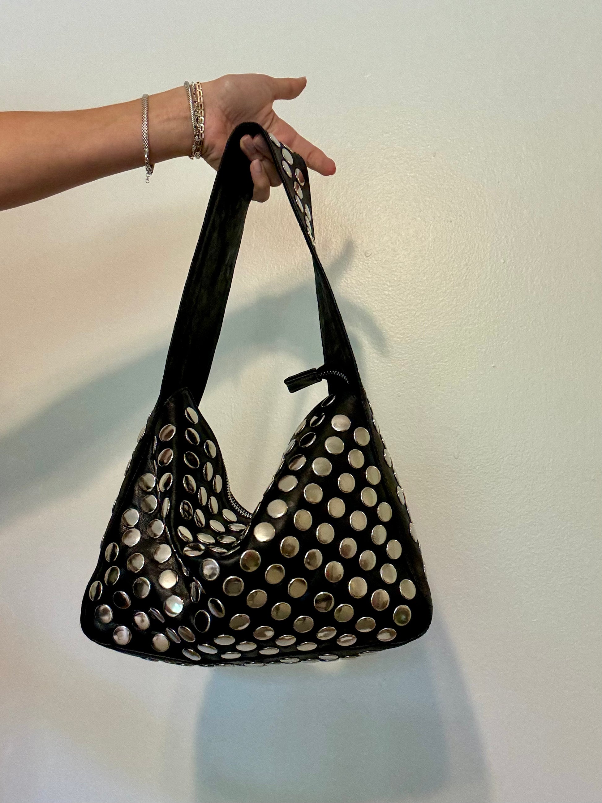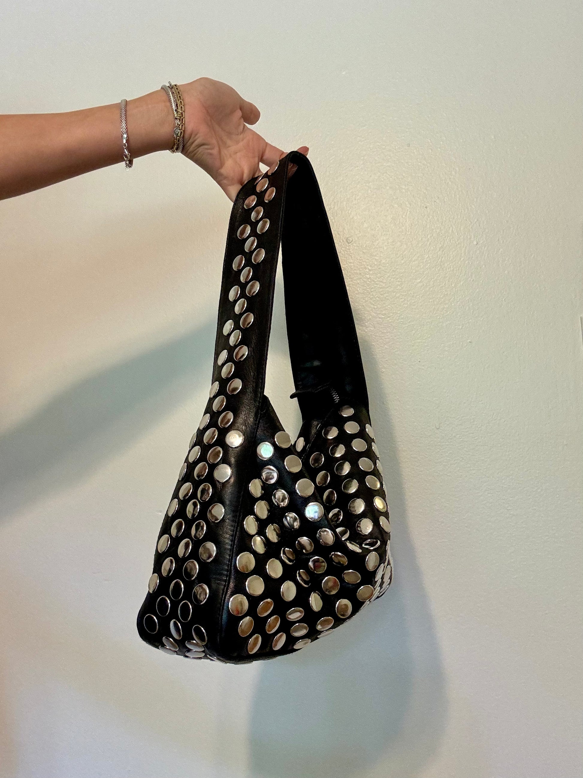 This sophisticated bag features a sleek leather construction adorned with studs, adding a touch of edgy glamour to your ensemble.